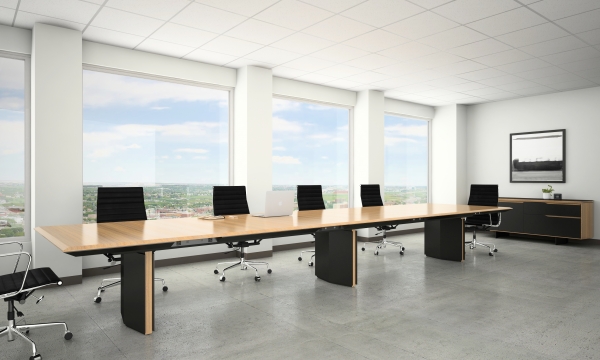 Ascari | Conference Table | 216” x 54” | Rectangle Paldao, Matte M76 Veneer Top with Chamfer Edge | Black Painted Closed Panel Bases with Paldao, Matte M76 Reveal