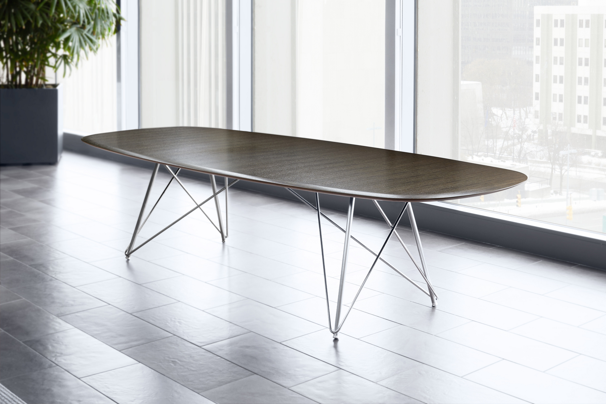 Baja | Conference Table | G71 Sable Black Limba Veneer | Soft Rectangle Top, Surf Edge | Polished Chrome Wire Frame Base