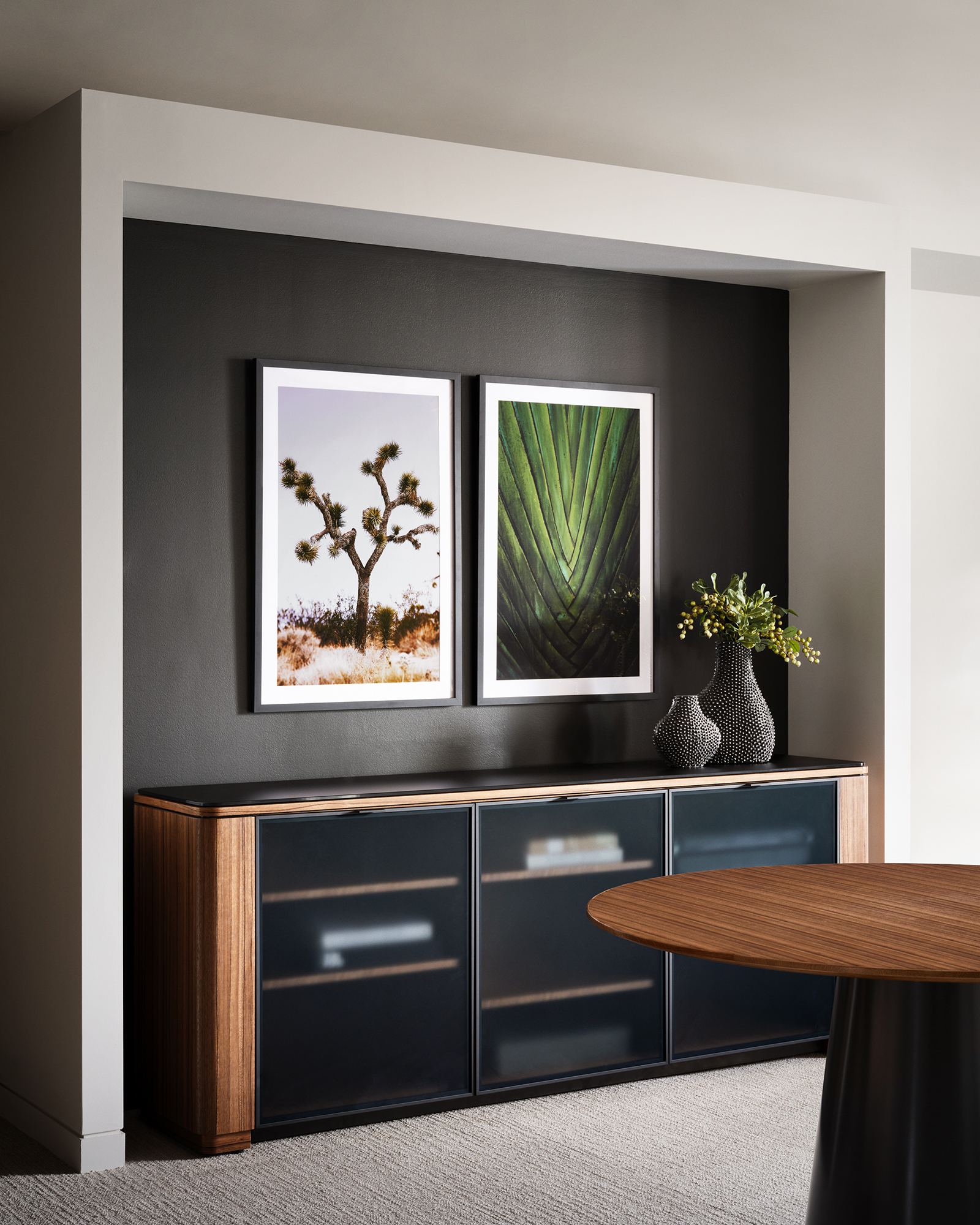 Compatta | Credenza | Black Satin Glass Top | Canyon Paldao Veneer Case | Black Matte Frame - Gray Satin Glass Doors | 2024 Chicago Showroom