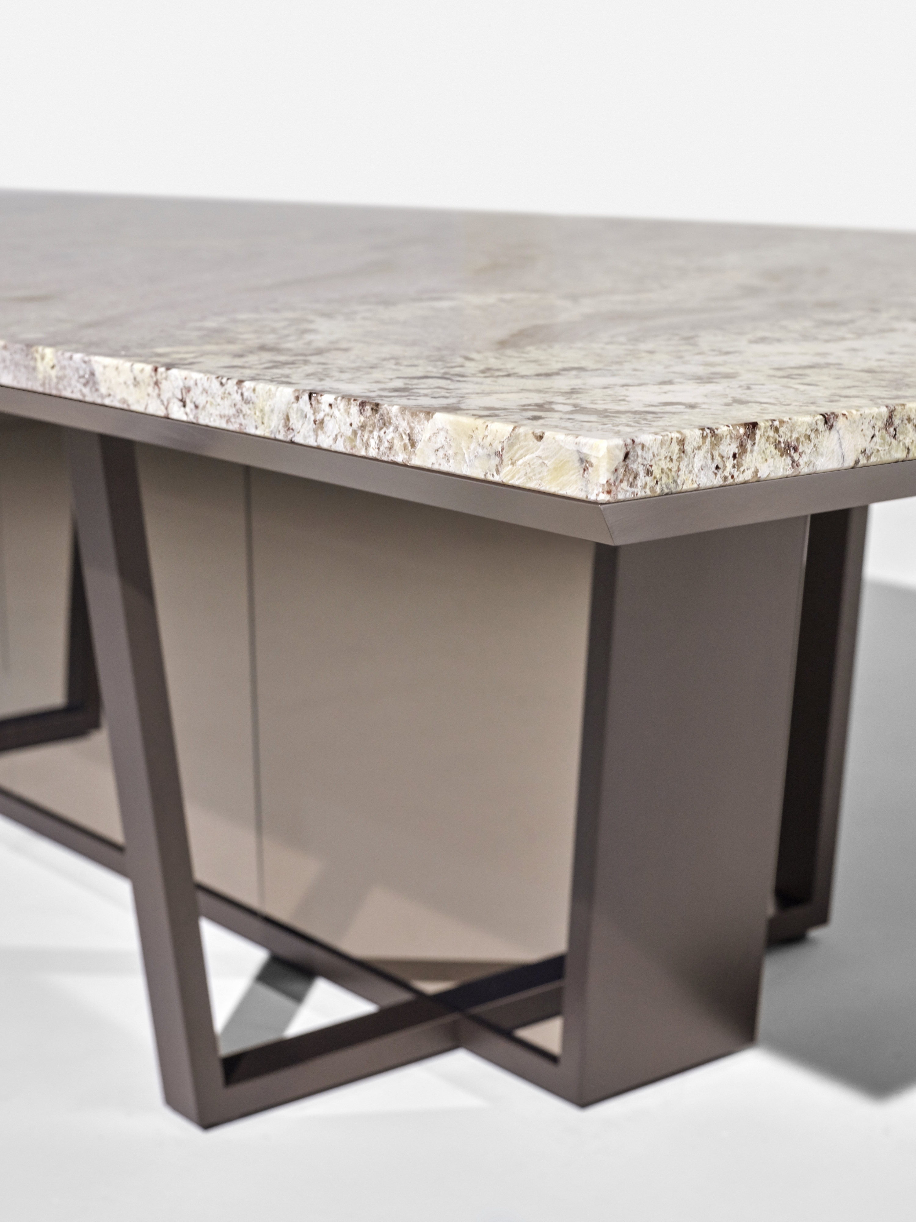 Crossbeam | Conference Table | COM Stone | Aged Bronze Base | Bronze Mirrored Acrylic | Side View Detail
