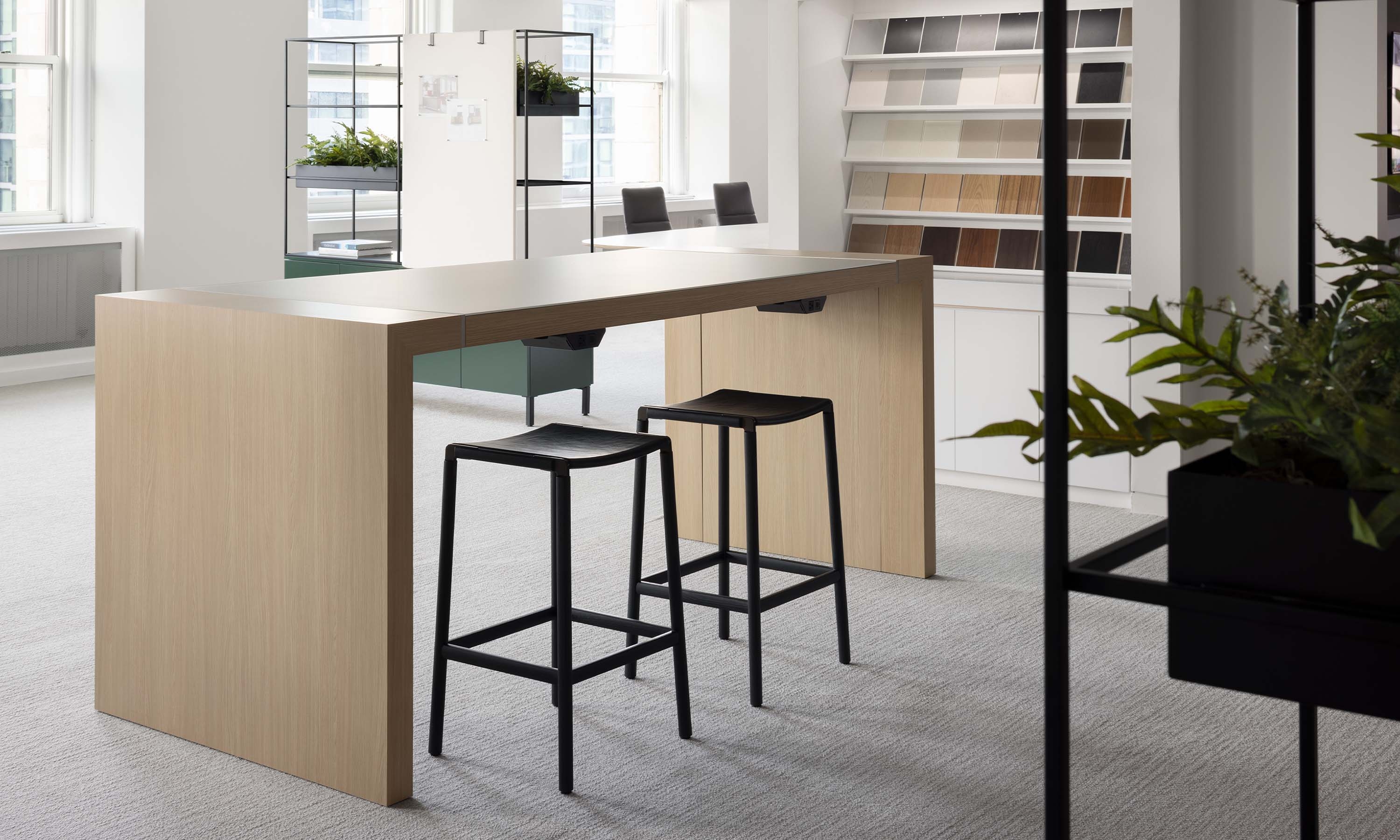 Tesano | Community Table | Standing Height | Glass and Laminate | 2023 Chicago Showroom